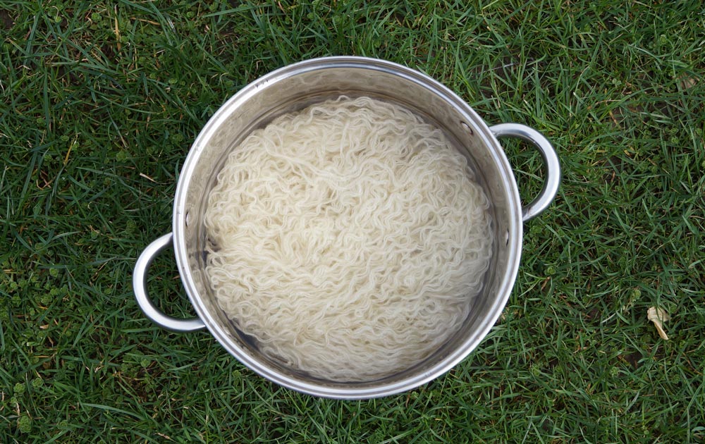 - Podgrzewaj kąpiel do uzyskania 90 oC, delikatnie mieszając od czasu do czasu. W gorącej wodzie wełna puchnie i rozchyla łuski, dzięki czemu roztwór ałunu wnika bez przeszkód we włókna. Utrzymuj temperaturę przez ok. godzinę, potem zdejmij z ognia i pozostaw wełnę w kąpieli do ostygnięcia.