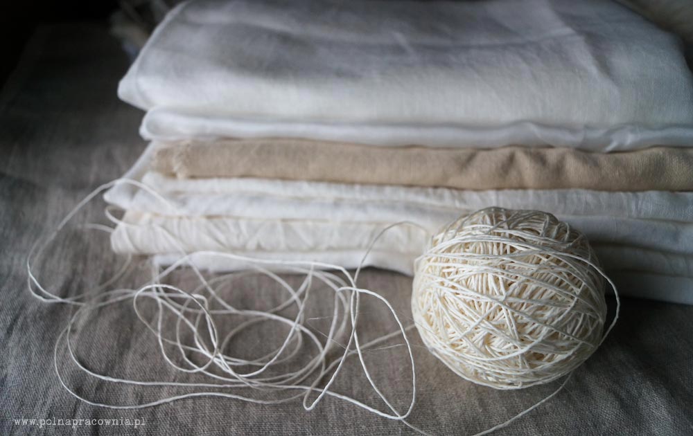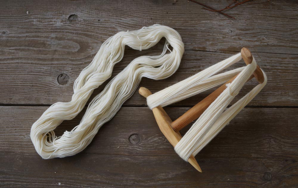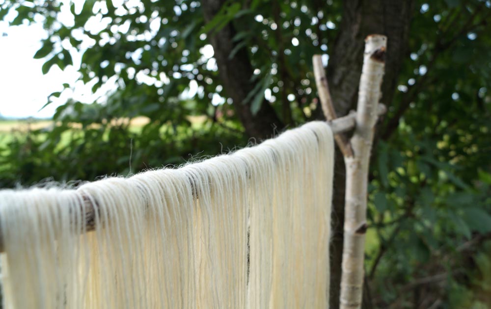 - Jeśli farbujesz wełnę w motkach – przewiń je w luźne zwoje (na motowidle albo na dużej książce ze sztywną okładką) i luźno zwiąż w kilku miejscach. Zaprawa i barwniki mogły swobodnie wnikać do włókien, a przędza nie będzie się plątać. Pamiętaj przy tym, że wełna w gorącej wodzie nabiera objętości, więc jeśli będzie związana zbyt ciasno – ałun nie dotrze do tych miejsc, a na przędzy pojawią się nieufarbowane paski.